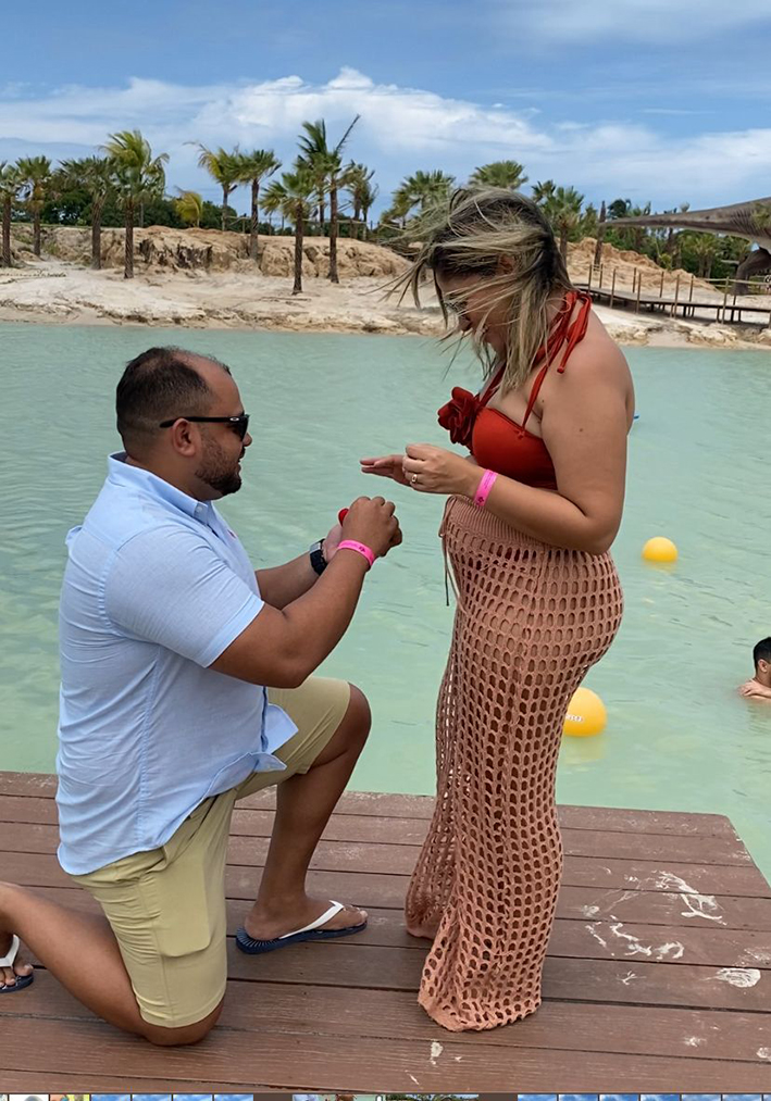 A advogada e jornalista, Tamyres Rebeca foi pedida em casamento durante viagem de carnaval, no Alchymist Lagoa Encantada em Cumbuco (CE). O noivo, o dentista Edgar Araújo, surpreendeu durante uma foto.
