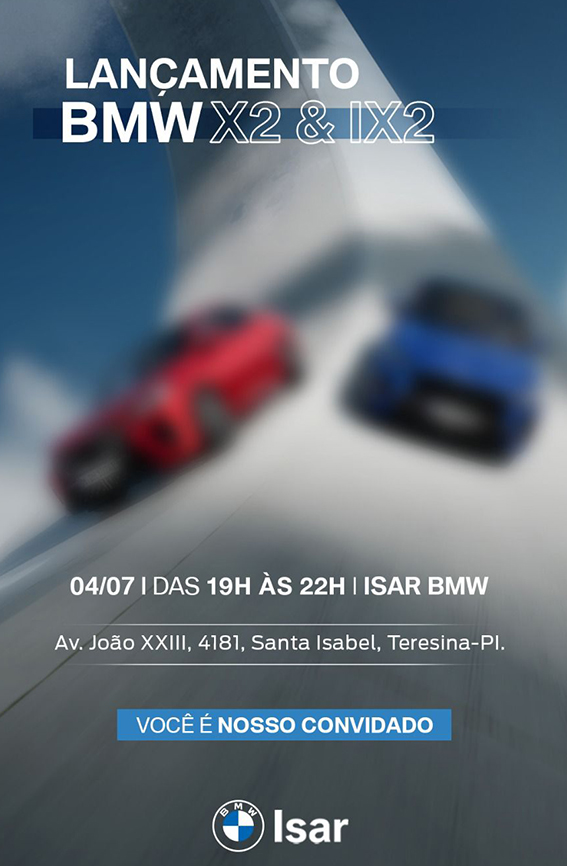 Hoje é o grande dia! Não perca o lançamento dos Novos X2 e iX2 na Concessionária Isar. Prepare-se para se surpreender com o incrível X2 e o revolucionário iX2. Não perca essa oportunidade única de presenciar a inovação automotiva! 📅 04/07/2024 ⏰ Das 19:00 às 22:00 📍 Concessionária