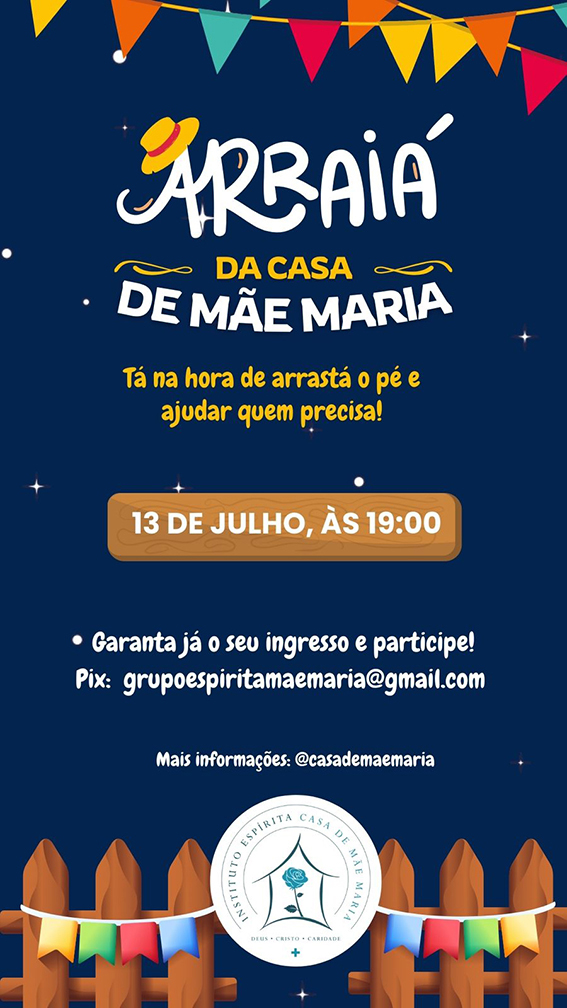 No dia 13 de julho, a Casa de Mãe Maria realizará seu Arraial Beneficente, cujo objetivo é angariar fundos para a manutenção dos projetos sociais da instituição. Todo o dinheiro arrecadado será revertido para beneficiar as crianças atendidas pelo Projeto Semeando Esperança.