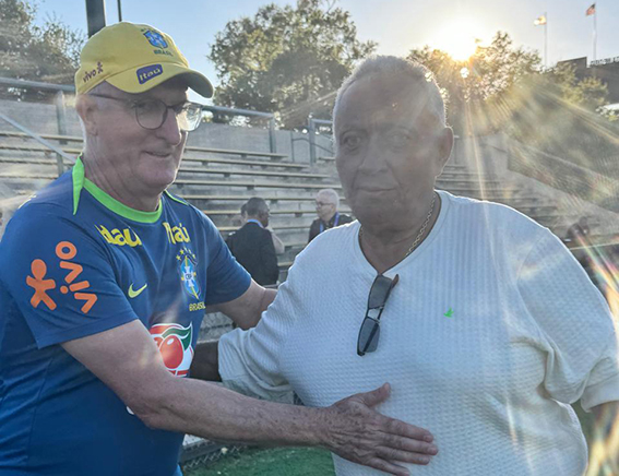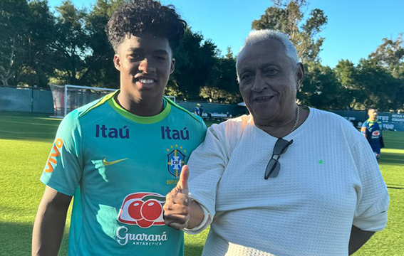 Robert Brown, presidente da Federação de Futebol do Piauí, junto ao atacante Endrick Felipe e ao técnico Dorival Júnior, durante o treino da seleção brasileira em Palo Alto, EUA. A seleção joga amanhã pela Copa América contra a Colômbia.