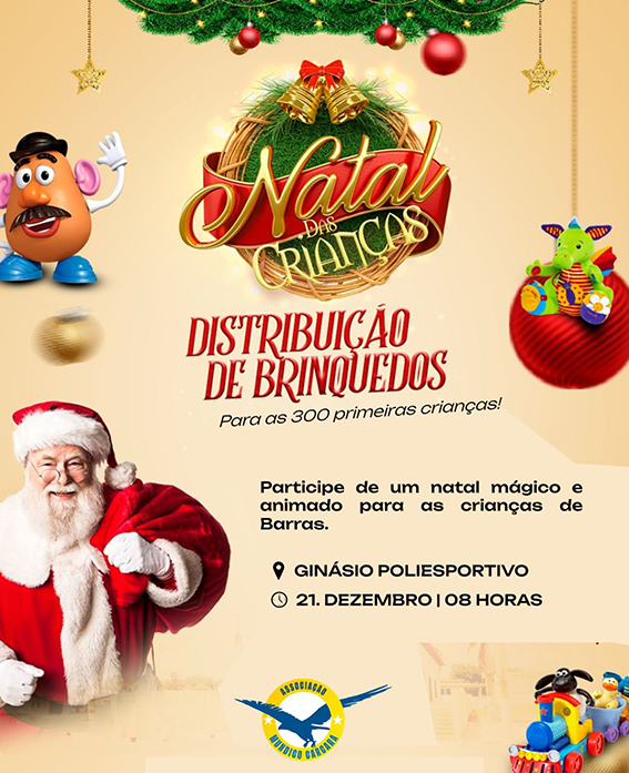 A cidade de Barras celebrará o Natal das Crianças com uma distribuição de brinquedos para as 300 primeiras crianças presentes no evento. A festa acontecerá no dia 21 de dezembro, a partir das 8h, no Ginásio Poliesportivo da cidade.Promovido pela Associação Mundo Cícero, o evento promete um dia mágico e animado, repleto de diversão para os pequenos. Papai Noel marcará presença para alegrar a criançada e tornar o Natal ainda mais especial.