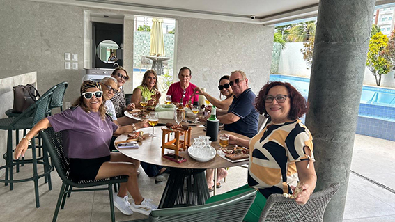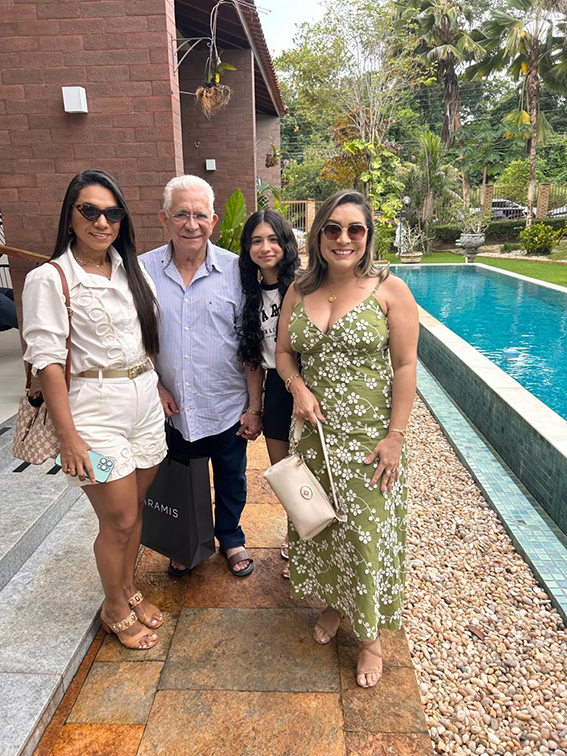 O empresário Geraldo Oliveira, referência no setor funerário no Piauí, ao lado da filha Fabiana Oliveira — diretora-geral do Grupo Geraldo Oliveira — e demais familiares, durante a comemoração do aniversário de Edvaldo Sepulveda, gerente administrativo do grupo.