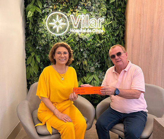 Este colunista com a administradora Raquel Villar, diretora administrativa do Hospital de Olhos Francisco Villar — parceiro da 12ª Carneirada do BL — recebendo as pulseiras do evento, que acontece no próximo dia 31 de maio, no Iate Clube de Teresina.