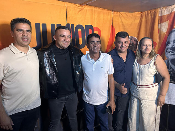 O prefeito Belauto Bigode de Alto Longá ao lado do cantor Junior Viana, do ex-prefeito e empresário Marcelino Almeida, do prefeito João Gomes e da primeira-dama Cristina, em um registro especial que marcou a programação festiva do município de Coivaras-PI.
