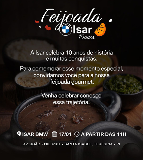 Em clima de celebração e bom gosto, a Isar BMW comemora 10 anos de história e conquistas com uma elegante feijoada gourmet, marcada para o dia 17 de janeiro, a partir das 11h, em sua sede na Avenida João XXIII, em Teresina. O encontro promete reunir clientes, parceiros e amigos da marca em um momento especial de confraternização, brindando uma trajetória de sucesso, excelência e sofisticação que consolidou a Isar como referência no segmento premium. Uma comemoração à altura de uma década de grandes realizações.