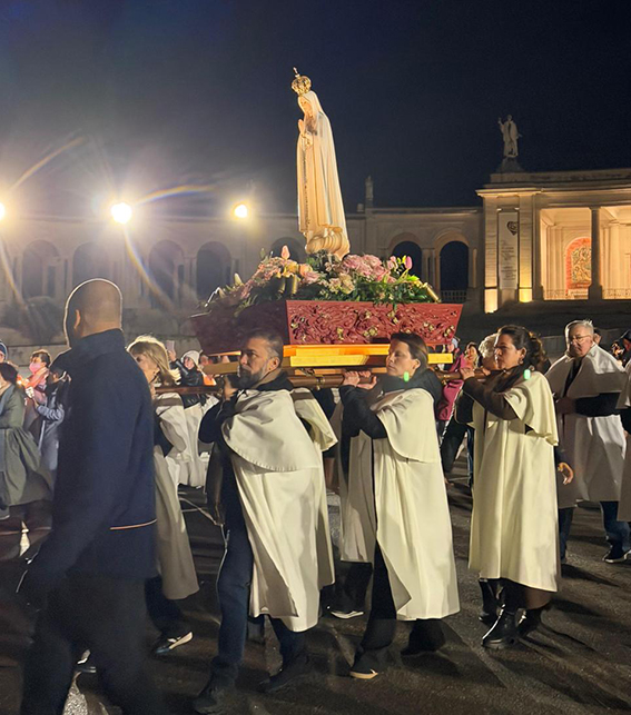 Padre Oscar conduz a imagem de Nossa Senhora de Fátima durante a tradicional Procissão das Velas, em um momento de fé e devoção que reuniu a comunidade. Entre os fiéis, Rita Leite também participou da celebração, reforçando a espiritualidade e a emoção da noite.