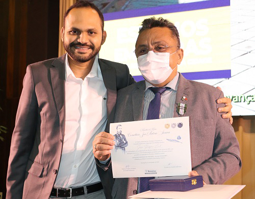 O vereador Edilberto Borges, o Dudu, foi homenageado com a Medalha do Mérito Conselheiro Saraiva. No registro, o homenageado ao lado do secretário municipal de Comunicação Lucas Pereira