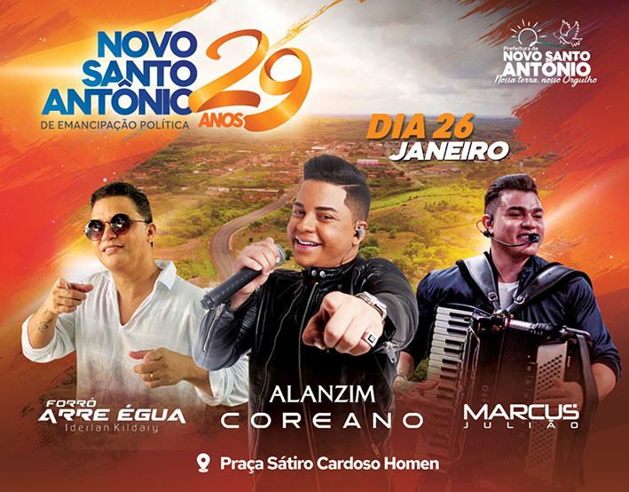 A cidade de Novo Santo Antônio estará em festa comemorativa por mais um ano de emancipação política. A prefeita Eliza Paz (PT) estará a frente da programação do aniversário dos 29 anos do município, que será aberta com Culto na Igreja Assembleia de Deus, às 19h, do dia 25. Dia seguinte, 26, final do Campeonato Municipal de Futebol, às 15h45, e às 18h, Missa em Ação de Graças na Igreja de Santo Antônio. As atividades seguem às 20h com entrega das premiações do Campeonato Municipal de Futebol e da Olimpíada Municipal de Matemática. Encerrando a programação festiva, às 21h, corte do bolo e festa dançante a partir das 22h, animada por Alanzim Coreano, Forró Arre Égua e Marcus Julião. A prefeita Eliza Paz espera a participação dos municípes durante as festividades, que prometem confratenizar os filhos da terra nesse período importante de aniversário de Novo Santo Antônio.