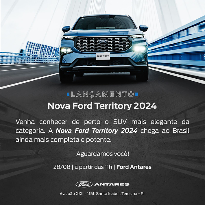 Chegou em Teresina a nova Ford Territory 2024,  responsável por suceder a linhagem anterior comercializada localmente desde agosto de 2020, o novo modelo adota design completamente renovado e chega às lojas da Ford Antares. localizado  na Avenida João XIII, 4151, Teresina-PI