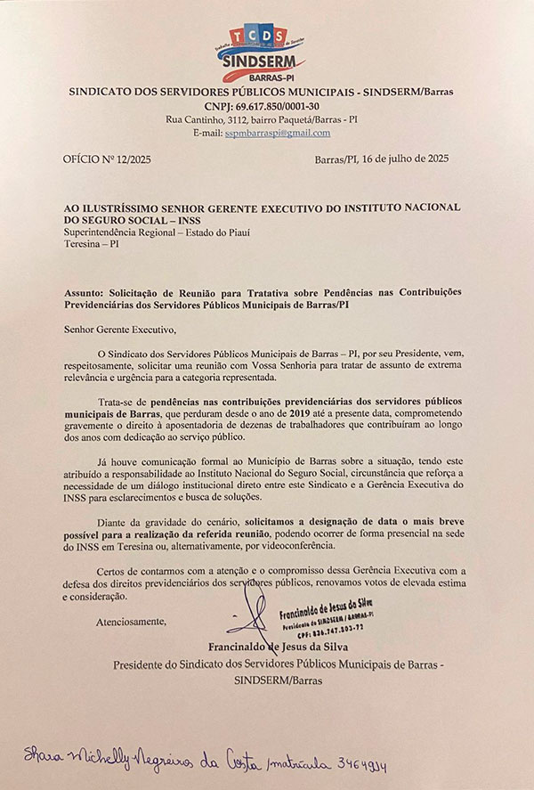 O presidente do Sindicato dos Servidores Públicos Municipais de Barras, Francinaldo de Jesus da Silva, encaminhou recentemente um ofício ao Gerente Executivo do INSS, solicitando uma reunião urgente para discutir o problema das contribuições previdenciárias não reconhecidas pelo sistema da Previdência Social.