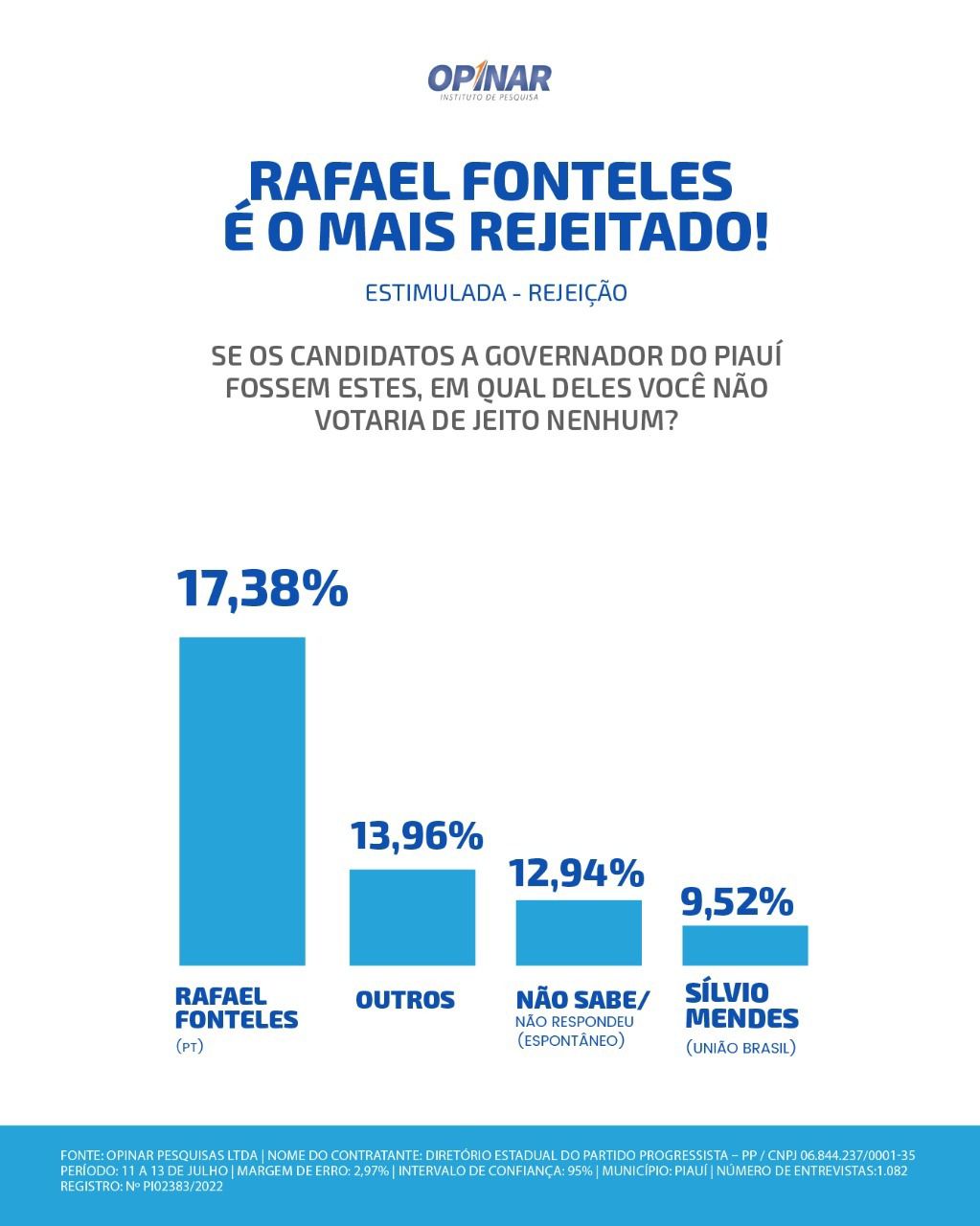 Rafael Fonteles aparece em primeiro lugar quando é perguntada a rejeição, isto é, em quem o eleitor não votaria se a eleição fosse hoje. O pré-candidato do PT tem 17,38% de rejeição.