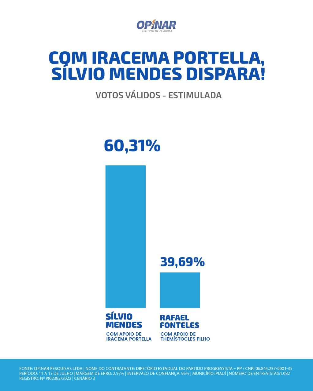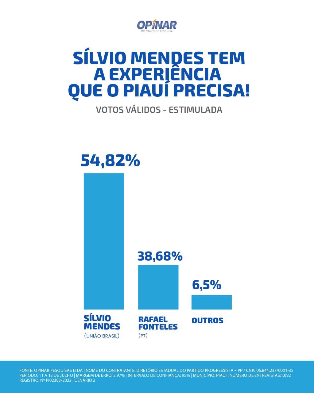 Em números por votos válidos, Sílvio Mendes teria 54,82% das intenções de votos, contra 38,68% de Rafael Fonteles (PT). A pesquisa foi realizada no período de 11 a 13 de julho, ouvindo 1.082 eleitores de cidades de norte a sul do estado sob registro na Justiça Eleitoral PI-02383/2022.