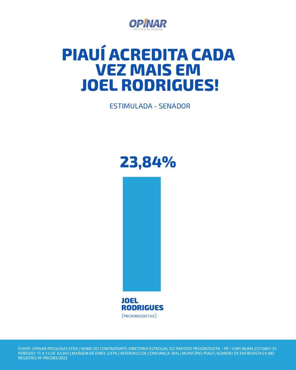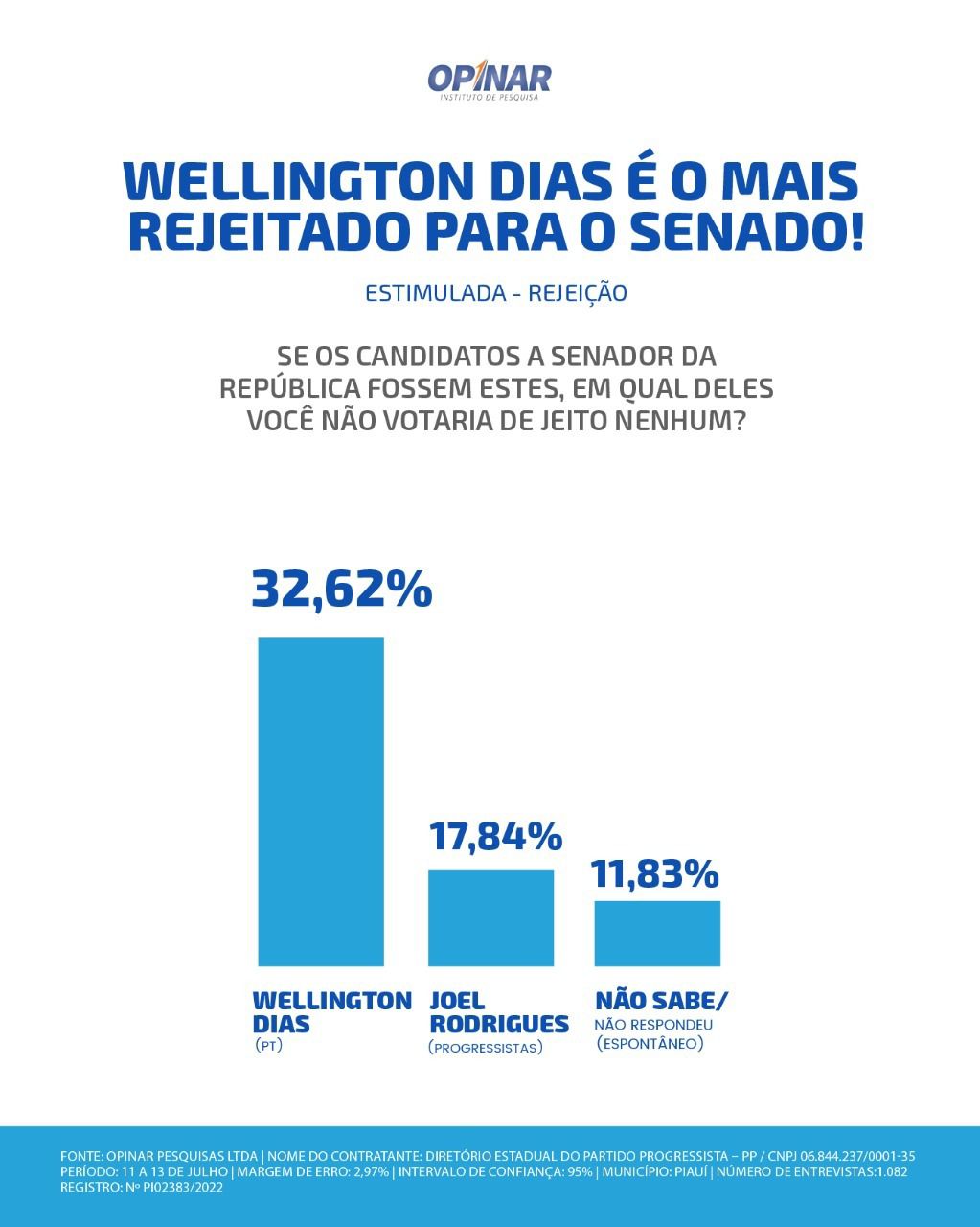 Na disputa com os pré-candidatos a senador, Joel Rodrigues (Progressistas tem crescido e já aparece com 23,84% das intenções de votos. Wellington Dias (PT) é o que registrou a maior rejeição, com 32,62%.