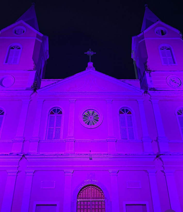 Símbolos religiosos recebem iluminação roxa simbolizando a abertura da quaresma