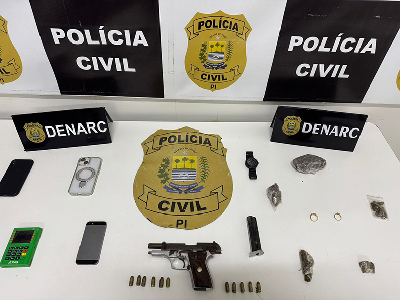 Durante a operação, os policiais apreenderam uma pistola calibre .380, uma quantidade significativa de drogas do tipo skunk, joias possivelmente oriundas de roubo e diversos aparelhos celulares.