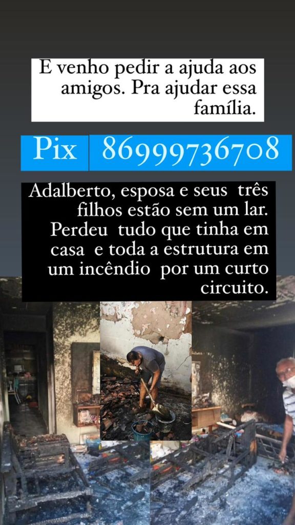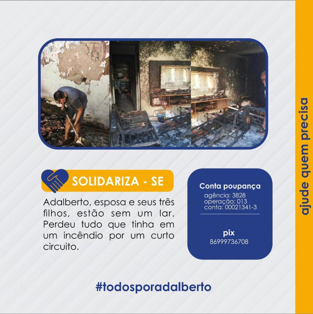 DestaqueGeral Todos por Adalberto segunda-feira, 19 de julho de 2021 Redação Hoje a palavra é solidariedade, Adalberto e sua família passam uma situação delicada, após ter sua casa queimada, eles agora estão sem lar, ajude!