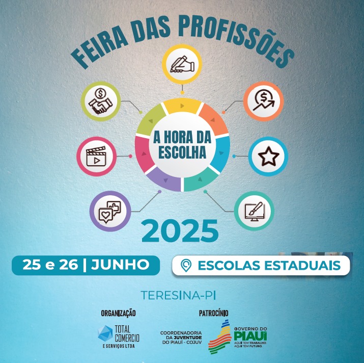 O Governo do Estado do Piauí, por meio da Coordenadoria da Juventude (COJUV/PI), convida todos os estudantes das escolas estaduais de Teresina para participar da Feira das Profissões 2025, que acontece nos dias 25 e 26 de junho!