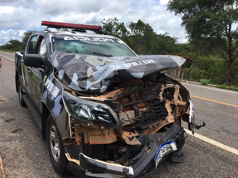 Uma viatura da Polícia Militar do Piauí ficou com a frente completamente destruída após colidir com um cavalo na BR-343, próximo ao município de Piracuruca. O acidente aconteceu nessa segunda-feira (18) e ninguém ficou ferido.