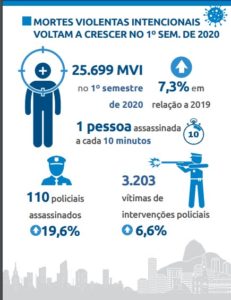 O número de 2020 representa um aumento de 117% em relação ao ano anterior. O anuário também destaca o crescimento de homicídios contra mulher. Foram 61 em 2020 e 46 em 2019. No caso dos feminicídios, houve registro de 29 em 2019 e 31 em 2020.